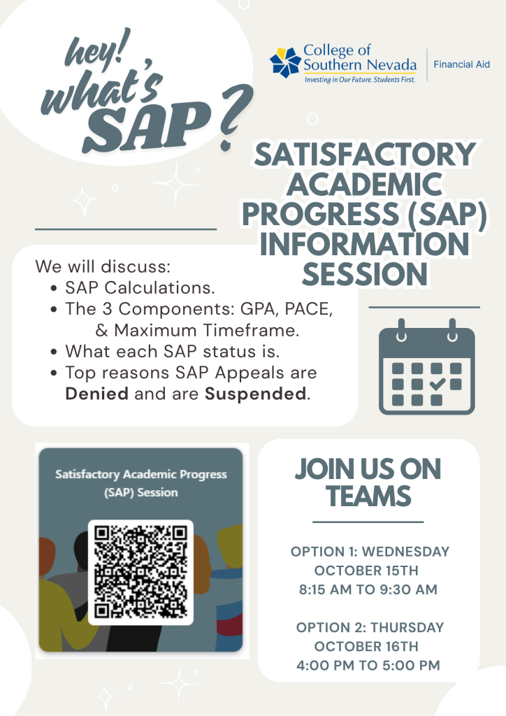 If you’ve ever heard the term Satisfactory Academic Progress (SAP) and thought it sounded like something you’d need a calculator or a translator for, you’re not alone. The Financial Aid team at the College of Southern Nevada is here to clear things up with two upcoming SAP Information Sessions that’ll make sense of the rules, the formulas, and the fine print.